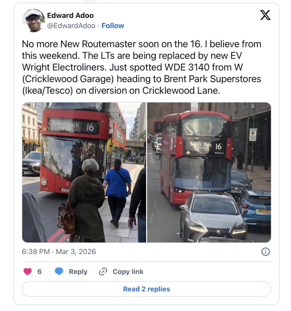 The buses will be removed from route 8 in June, route 16 in October, route 313 in November, and route 267 next year. They are also scheduled to be taken off route 21 in October 2028. More routes may follow as Transport for London (TfL) introduces battery-electric buses.