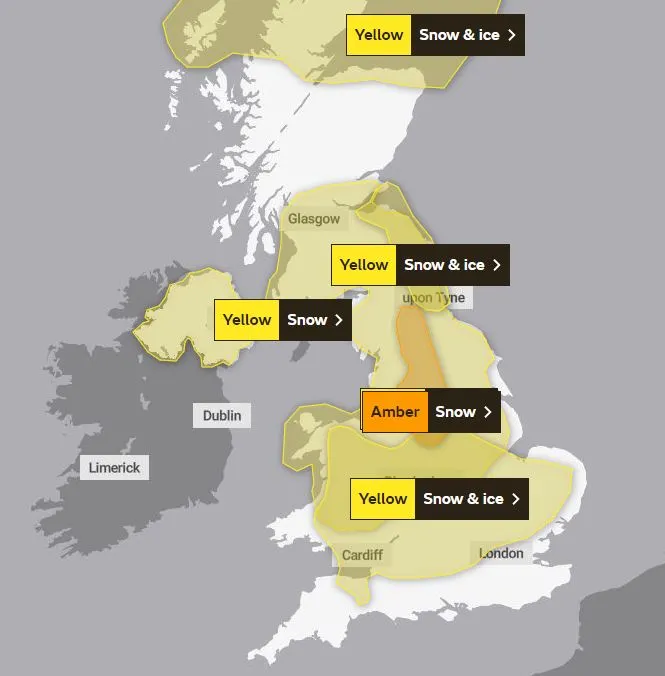 Meanwhile, the Met Office has issued multiple yellow weather warnings for snow and ice across the UK. The alerts cover the East Midlands, West Midlands, North East, North West, and Yorkshire and the Humber from 8am Monday until 8am next Friday.