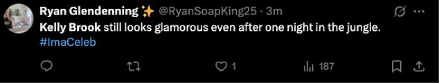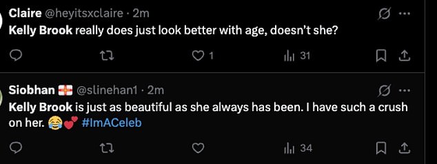 Despite her complaints about jungle life, viewers were quick to praise Kelly’s fresh-faced appearance. Many fans took to X to comment on how glamorous she still looked after just one night in the wild. Reactions included: “Kelly Brook still looks glamorous after one night in the jungle,” and “She really does look better with age.”