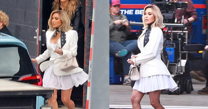 Kardashian completed the transformation with a chic all-white outfit, featuring a plunging mini dress with a pleated skirt and a structured blazer that highlighted her waist. She accessorized with a black polka-dot scarf tied at the neck and pointed heels, combining vintage-inspired elegance with her modern signature style.