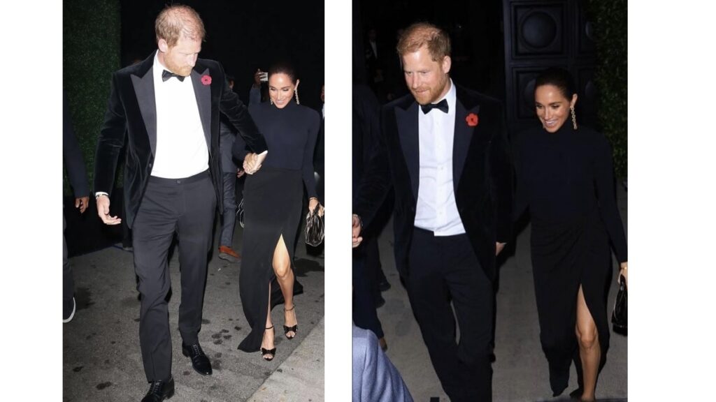 For the evening, Meghan Markle stunned in a chic black long-sleeved top paired with a matching floor-length skirt, accessorized with Aquazzurra tie-up sandals and a velvet clutch. Prince Harry looked effortlessly stylish in a tailored dark suit before later changing into a classic tuxedo for the second event of the night.